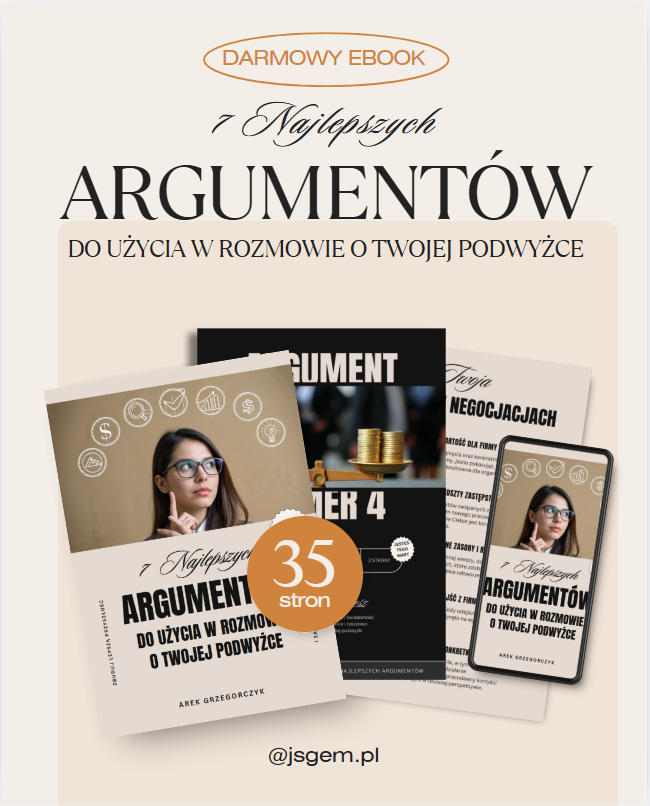 Dlatego stworzyłem poradnik: „7 argumentów po których szef da Ci podwyżkę nawet jeśli nie będzie chciał”. To konkretne, sprawdzone argumenty, które sam stosowałem i które działają. Bez pustych frazesów – tylko to, co naprawdę skuteczne w rozmowie z szefem. Bo każdy zasługuje na uczciwą rozmowę o swojej wartości.